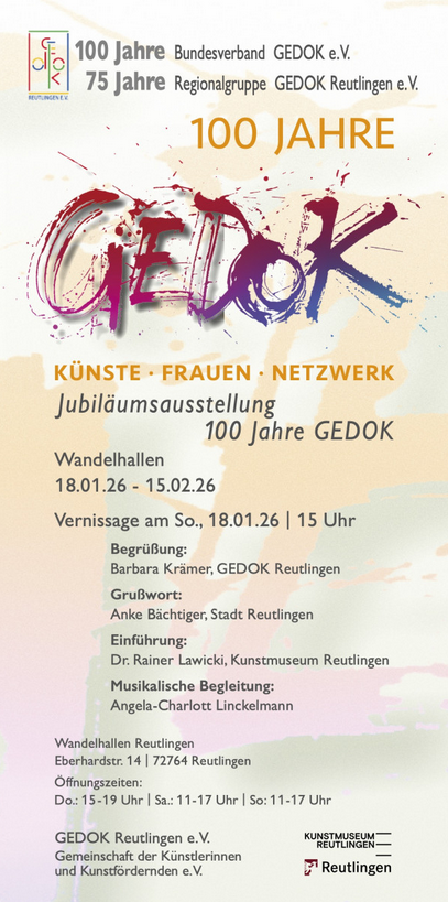 Seit 75 Jahren ist die GEDOK in Reutlingen fest verankert und prägt dort kontinuierlich das kulturelle Leben. Das doppelte Jubiläum bildet den Anlass für die Ausstellung „100 Jahre GEDOK – 75 Jahre GEDOK in Reutlingen. Frauen · Künste · Netzwerk“ in den Wandelhallen des Kunstvereins Reutlingen.